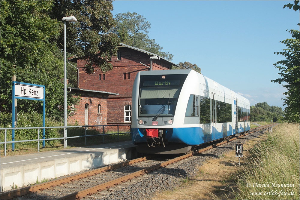 Der rote Zug mit der weiß/schwarzen Haltepunkt-Tafel daneben verläßt gerade Kenz. Nochmals überrascht war ich, als ich das Stationsschild sah. Obschon die Station meines Wissens einfach nur "Kenz" heißt, stand auf dem Stationsschild "Hp Kenz". Das mußte dann natürlich für ein Bild herhalten.